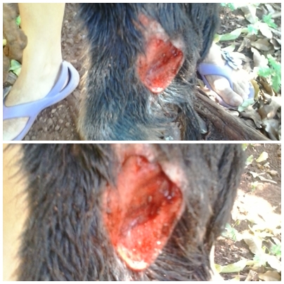 Na tarde desse sábado (18), a ONG SPA-Uraí recebeu informações de que havia um cachorro com ferimentos graves na rua Natal.