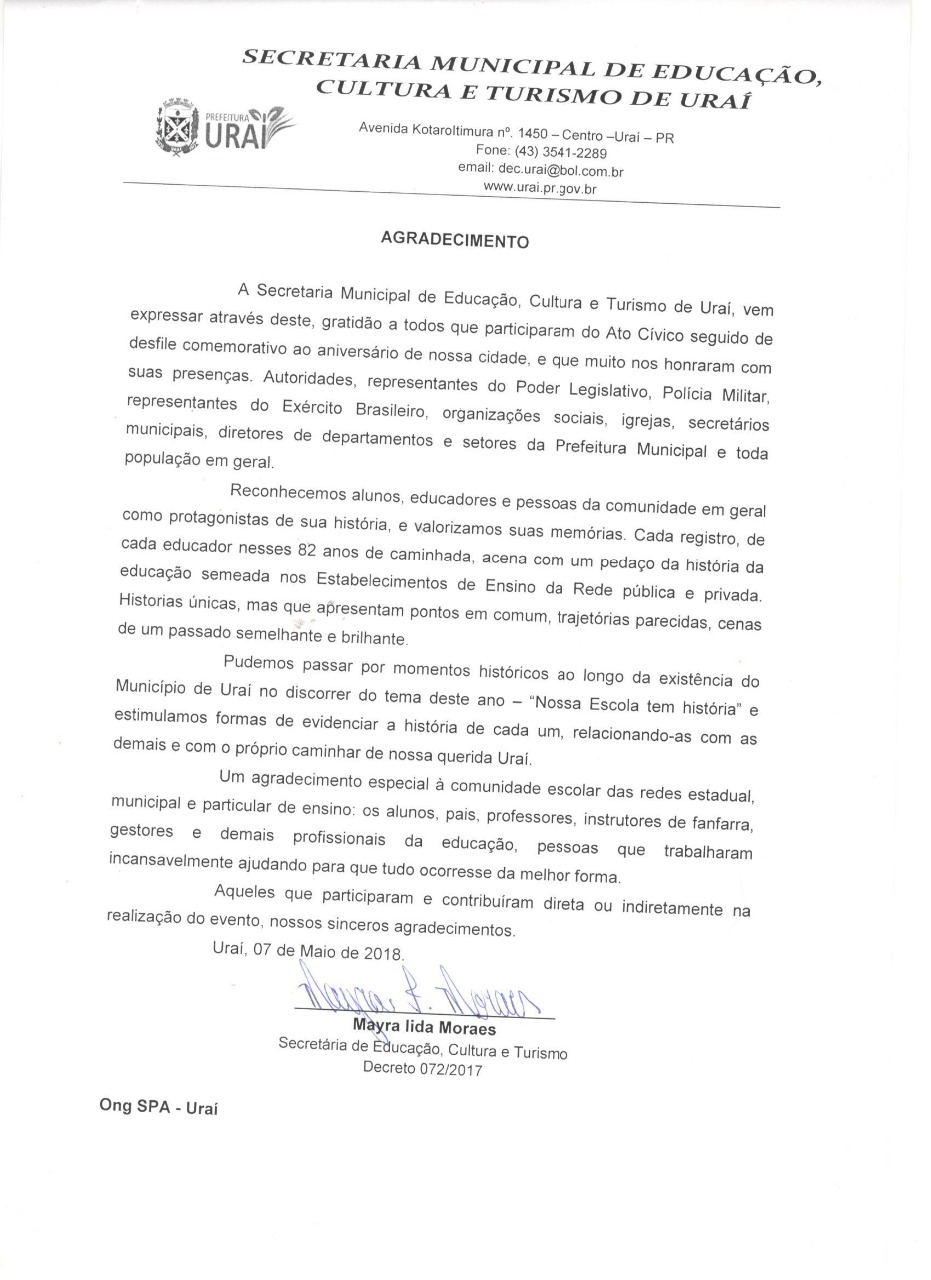 Na manhã deste domingo, 06 de maio, a ONG-SPA, pelo segundo ano consecutivo foi convidada a participar do desfile em comemoração aos 82 anos da cidade. O ato civico teve como tema "Nossa Escola tem história" onde foi lido as histórias de fundação de todas as entidades e escolas participantes.